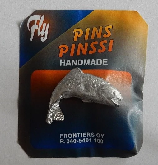Fly:n hieno, taimenta kuvaava pinssi. Pituus:30mm. Pinssissä neula, jolla sen voi kiinnittää haluamaansa asusteeseen.