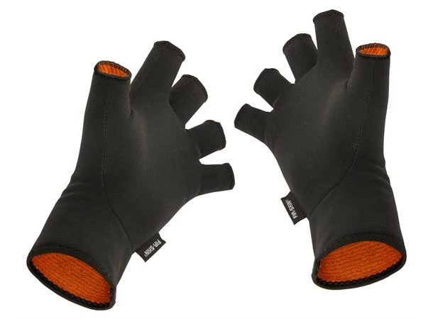 Sormikkaiden materiaali on Fir-Skin CGX, joka on tehty:Polyester 62%, Spandex 10%, Graphite 13%, Ceramic 9%, TPU 6%. Väri:Musta, oranssi sisäpuoli.