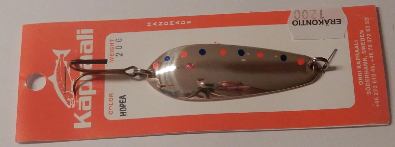 Onni Kapraalin valmistama mahtava lohi-taimen lusikka koviin koitoksiin, paino:20grammaa.