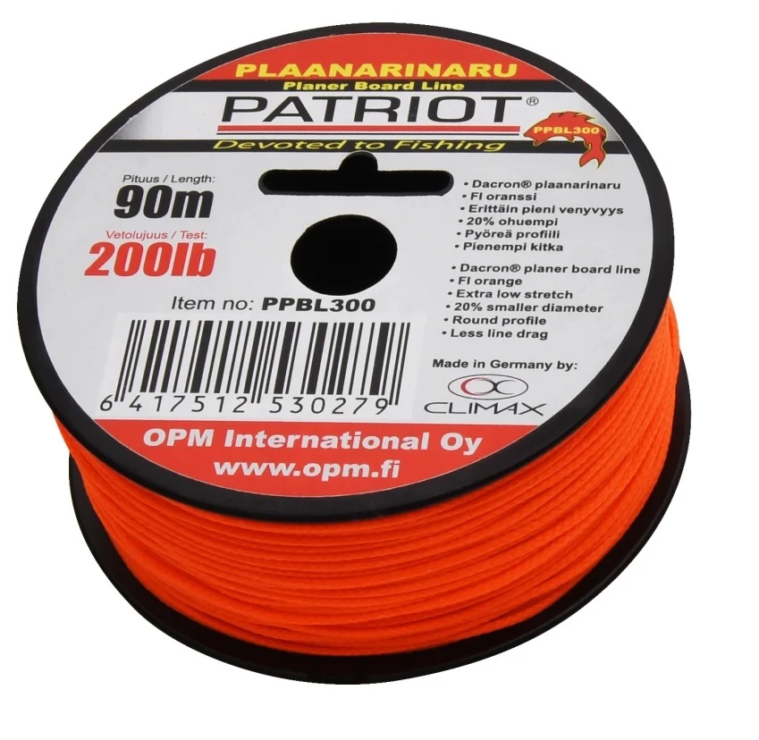 Patriot plaanarinaru on huippulaadukas, kestävä ja liukas naru käytettäväksi vetouistelussa. Rullan pituus 90 m, vetolujuus 90 kg. Värinä kirkas oranssi, joka näkyy hyvin vettä vasten.
