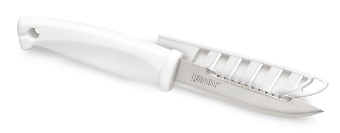 Rapalan valkoinen kalastajanpuukko, jossa on suomustusterä tavallisen terän lisäksi, valkoinen tuulettava tuppi, terän pituus:10cm.